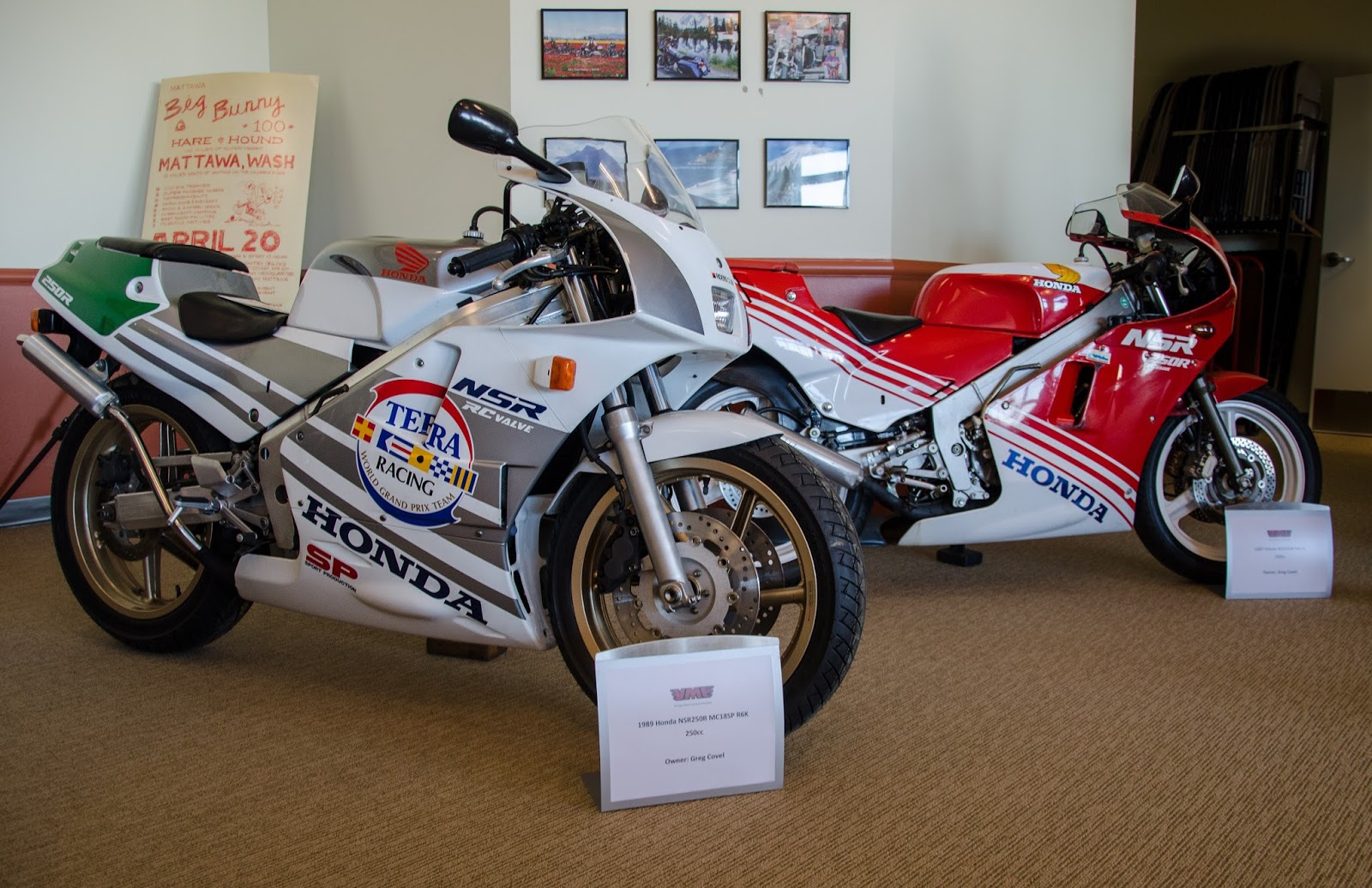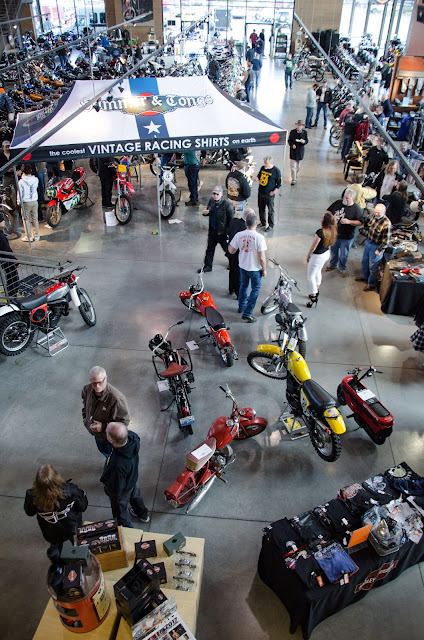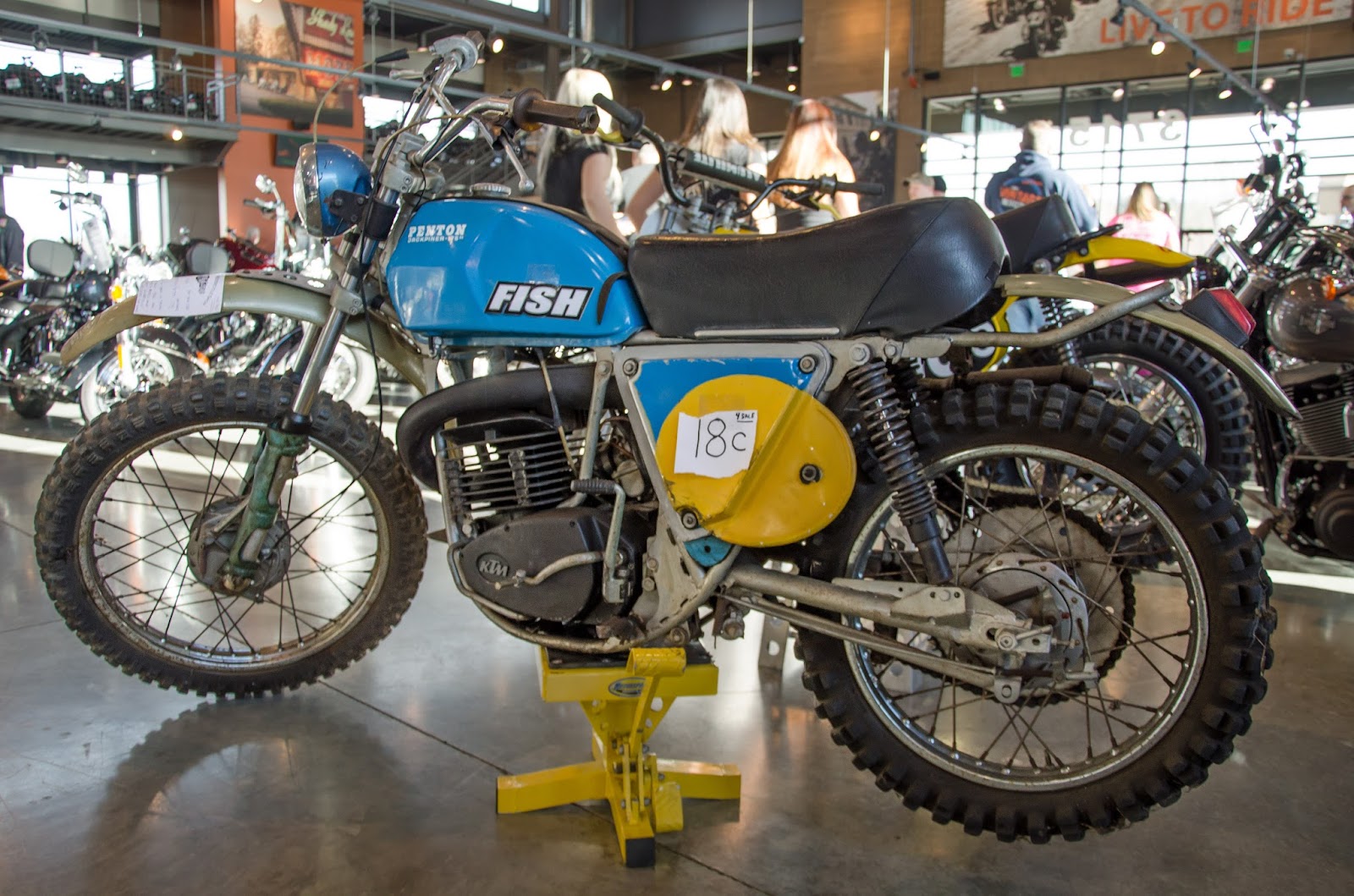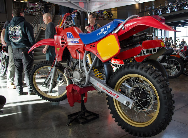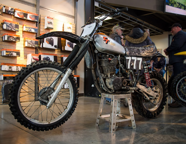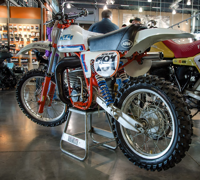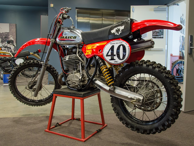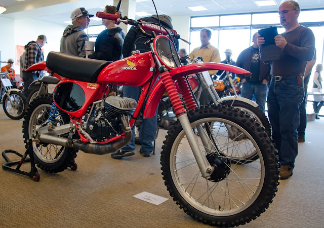 Hiding under the dark stairwell, the '75 Honda CR250 Elsinore. Didn't sell in the numbers of the CR125, but a cool bike in its own right.